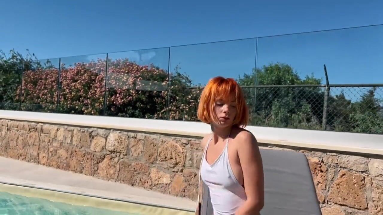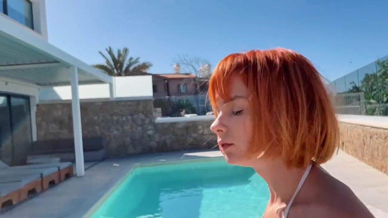 Charming red-haired girl sunbathing by the pool in a sexy swimsuit