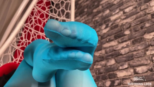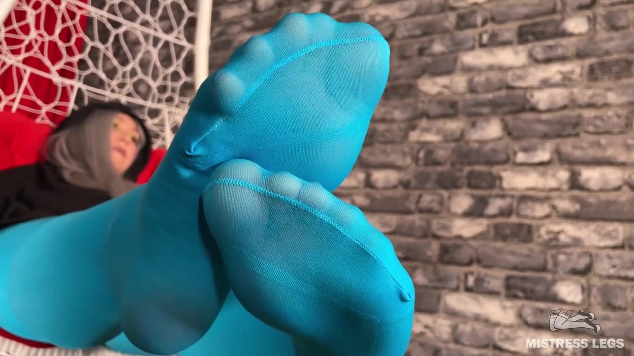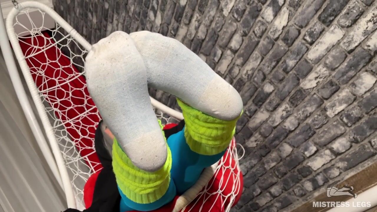 Mistress foot teasing you in hanging chair in white dirty socks and blue tights