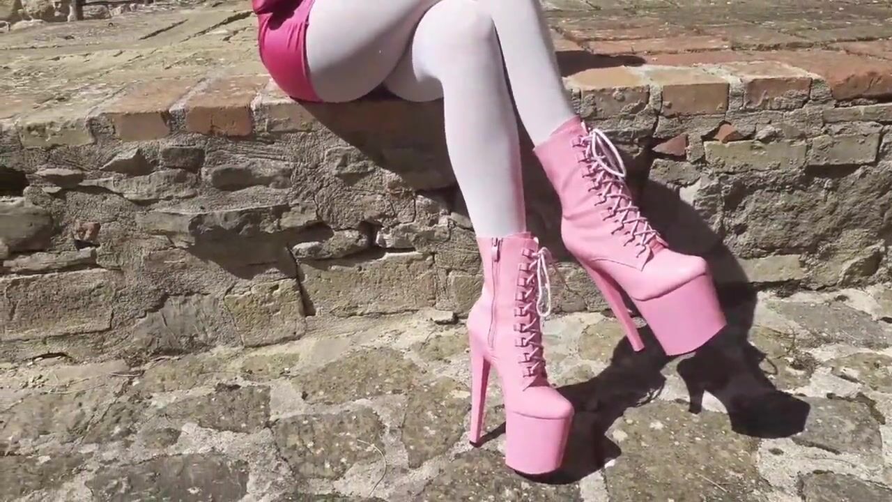 Outdoor pink outfit, wearing 8 inches platform ankle boots