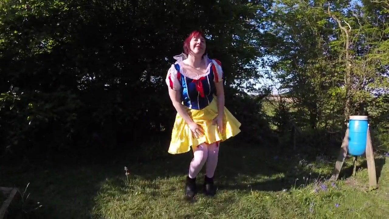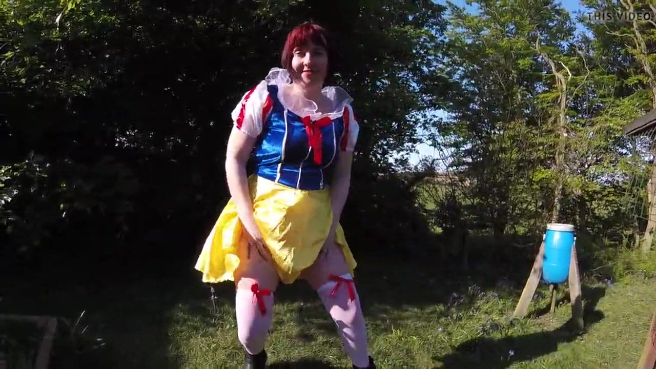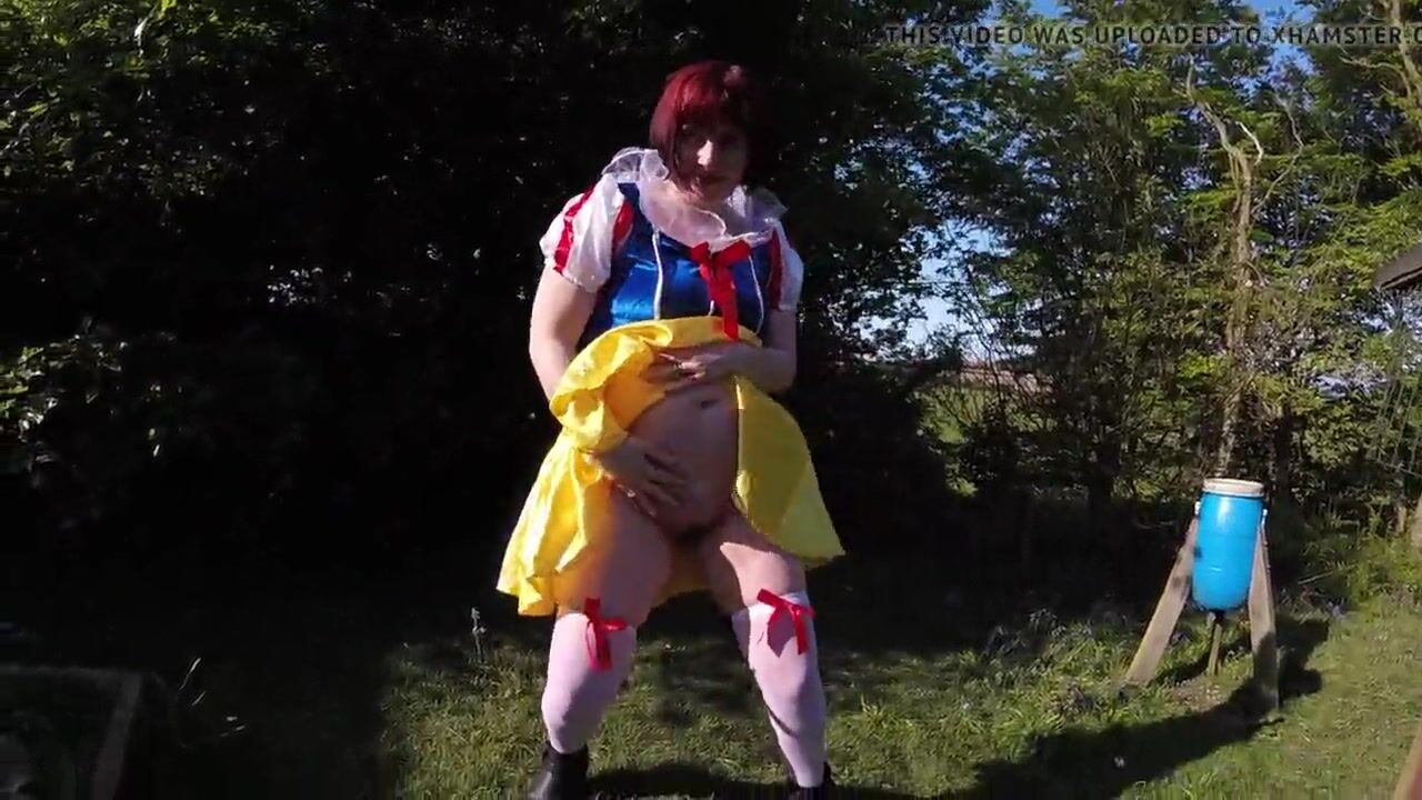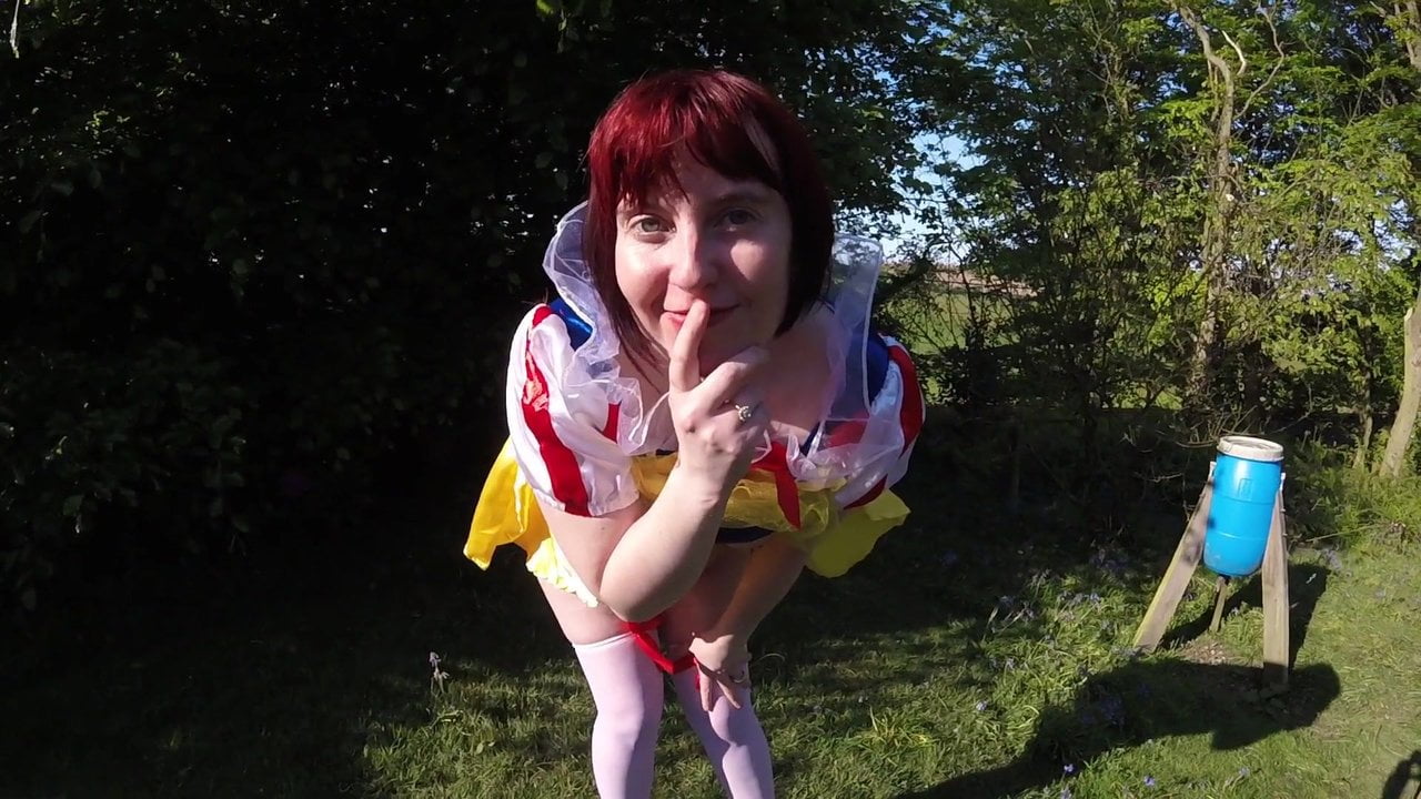 Snow White cosplay flashing Outdoors