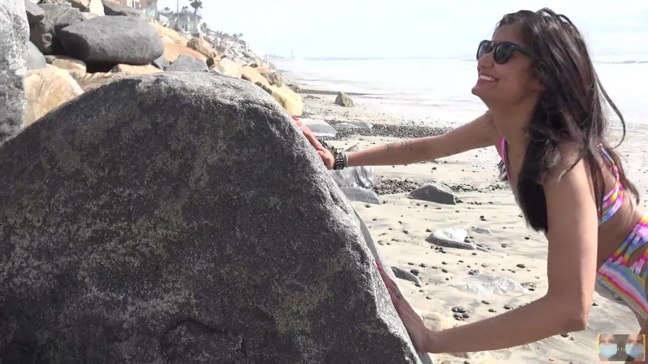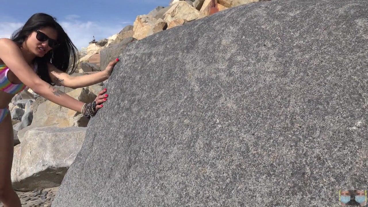 Strong Powerful Bikini Babe Pushes Rock