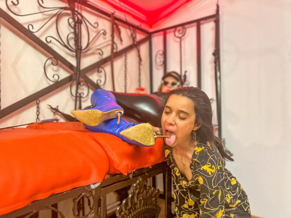Submissive girl deepthroat both of my heels simultaneously - Lezdom Lesbian Domination