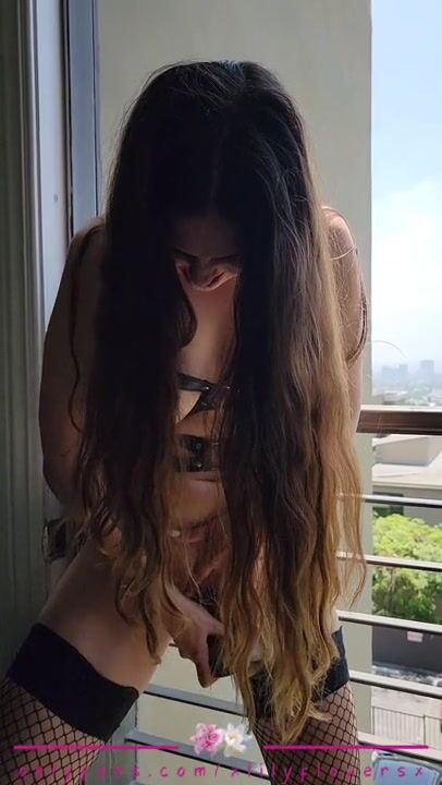 Tattooed Naughty Amateur Solo MILF Fucks and Sucks BBC Dildo on Hotel Balcony